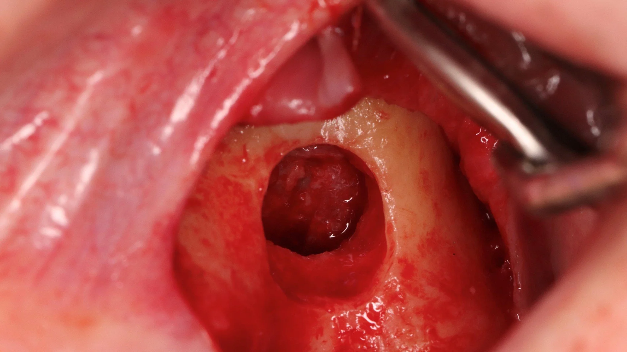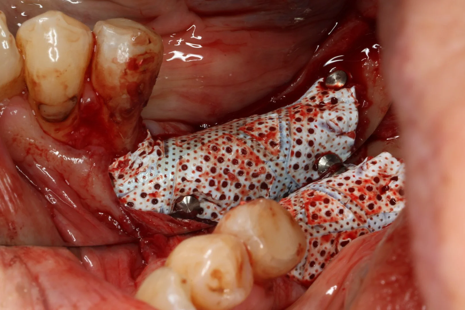 Het Schneiderse membraan is zorgvuldig los geprepareerd van het bot zonder deze te perforeren. De ruimte ertussen wordt opgevuld met botkorrels en afgedekt met een membraan zodat er voldoende bothoogte ontstaat voor een implantaat.