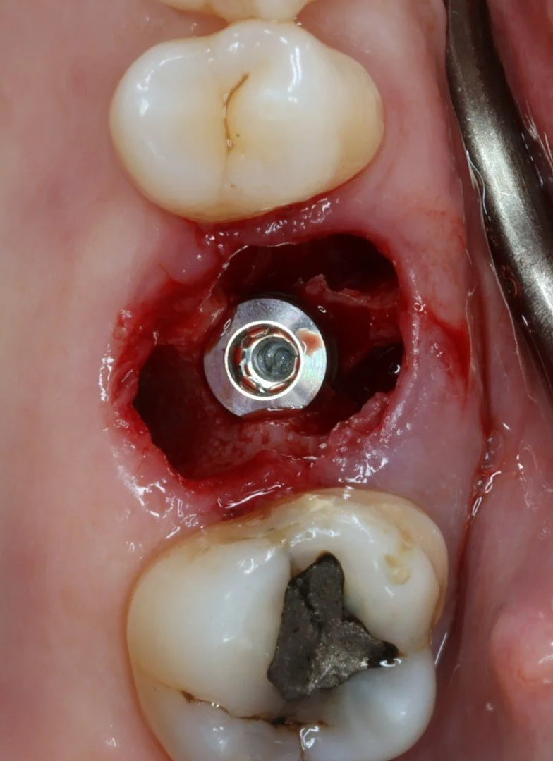 Een atraumatische extractie is hier extra van belang om de architectuur van de zachte weefsels te behouden. Omdat de implantaatplanning altijd prothetisch gedreven is, is het implantaat in de meest gunstige prothetische positie geplaatst.